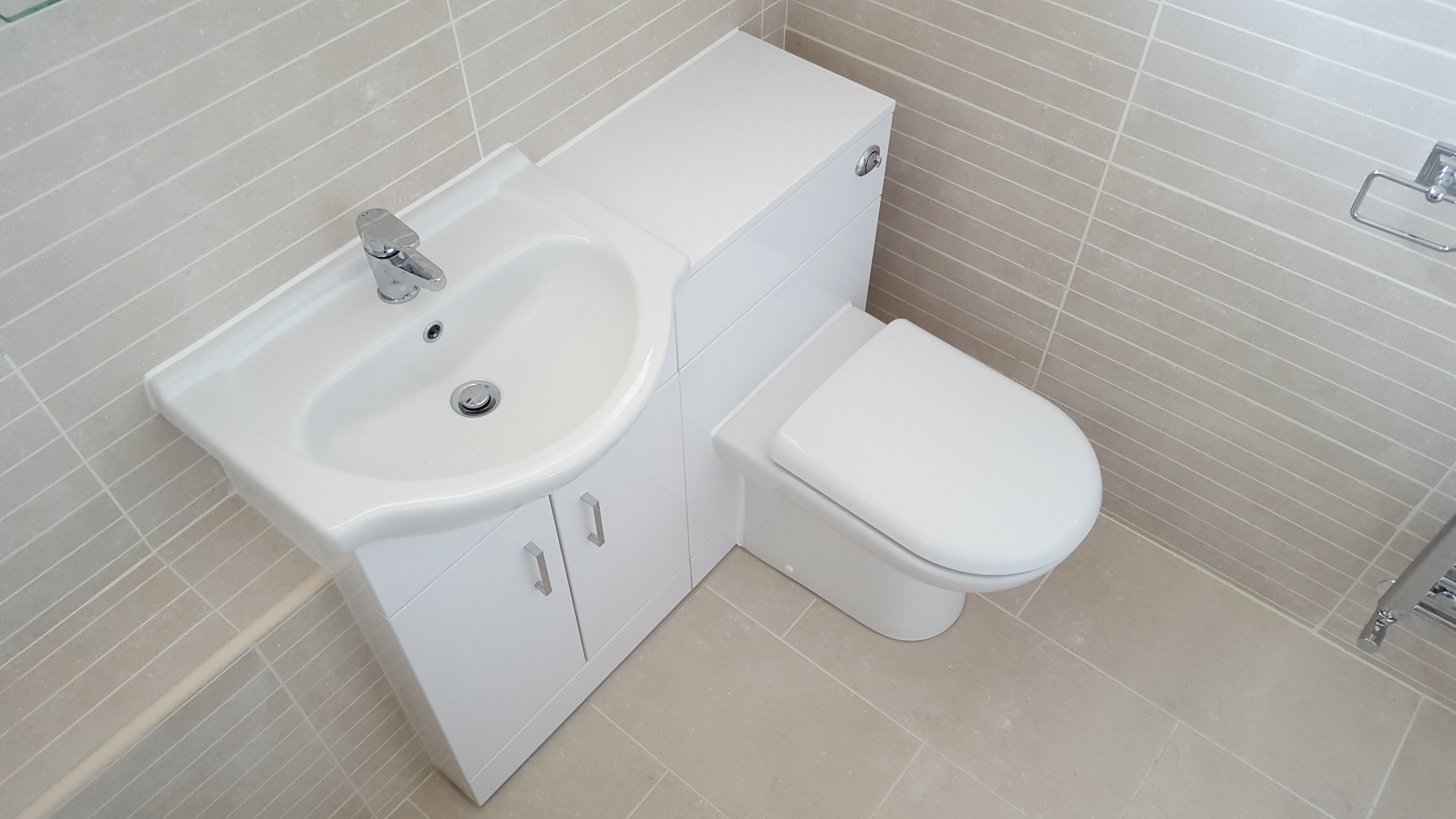 Wall hung vanity units with a of the plumbing hidden in the wall give a greater feeling of space in the bathroom.